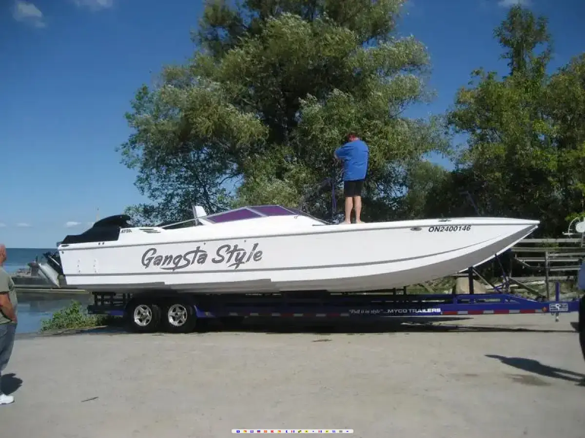 32' Active Cat, Kevlar boat... built by the legendary Ross Focht of Ocean Express powerboats. It is in pristine condition, and has upgraded front Skater bucket seats with zero effort racing shifters and throttles built into the drivers seat. Also included is a nearly new Myco tandem axle cat trailer, built specifically for this boat (was $13,000 new) with less than 5,000 miles on it. This is an authentic example of the competitive wide-body catamaran used to achieve high-speeds in offshore racing. Depending on the power option, it is capable of speeds well in excess of 120 mph. Plug your power in, and play with the big boys. The price for the rigged hull on the trailer. $26,995.00 or best reasonable offer Also available is a fresh set of Mercury Super Speedmaster IIIA outdrives, and HD transom assemblies. Price to be negotiated. Call Alan for info (905) 252-0592 or (905) 722-6684. PLEASE, SERIOUS INQUIRIES ONLY PRICE REDUCED $22,500.00