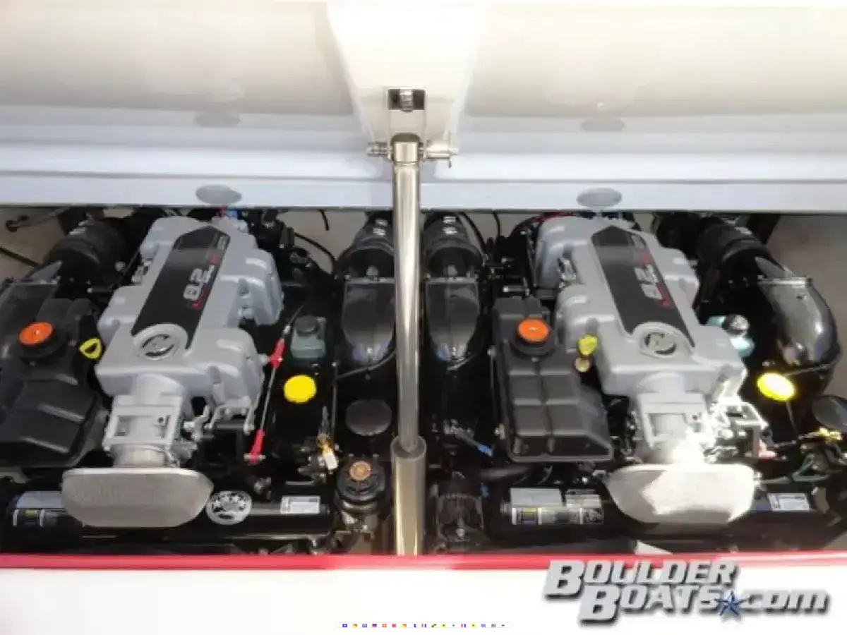 Featuring: Twin Mercruiser 8.2 Mag H.O.'s, 430 HP with Bravo One X outdrives, full instrumentation w - Livorsi gauges, Mercury SmartCraft, tilt - power steering, teak flooring w - snap out carpet, cup holders, bimini top, mid cabin, Alpine AM - FM CD satellite ready stereo, 2 cabinets w - built-in ice chests, lights, fan, storage galore, power engine hatch, dual batteries w - switch, 2 battery chargers, vented stepped hull, Gibson performance mufflers, trim tabs, drive showers, stainless steel props, full boat dust cover, and a triple axle trailer w - matching spare, trailer guides and LED lights.