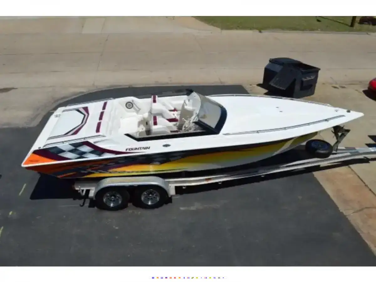 Immaculate condition. 8k custom air brush graphics by Custom Touch Austin TX. This is not a wrap. 502 MAG EFI Bravo One. Imco custom exhaust with captain call 4 blade lab-finish Reggie custom prop drive shower. New dual batteries. 245 fresh water hours. White leather with polished stainless trim. Pristine cabin, never used. Sleeps 2. Graphic custom gauges with bezels. Kenwood sound with amp 6 speaker with remote. Halon firesystem. Both covers with new bimini. Professionaly maintained with records. Stored indoors. All aluminum trailer with HD axles. 5 chrome cragar wheels with good rubber. 4 wheel disc brake. Removable quick release poles. Many more Fountain options. Stainles power steering. Power tabs. Battery quick hookups.