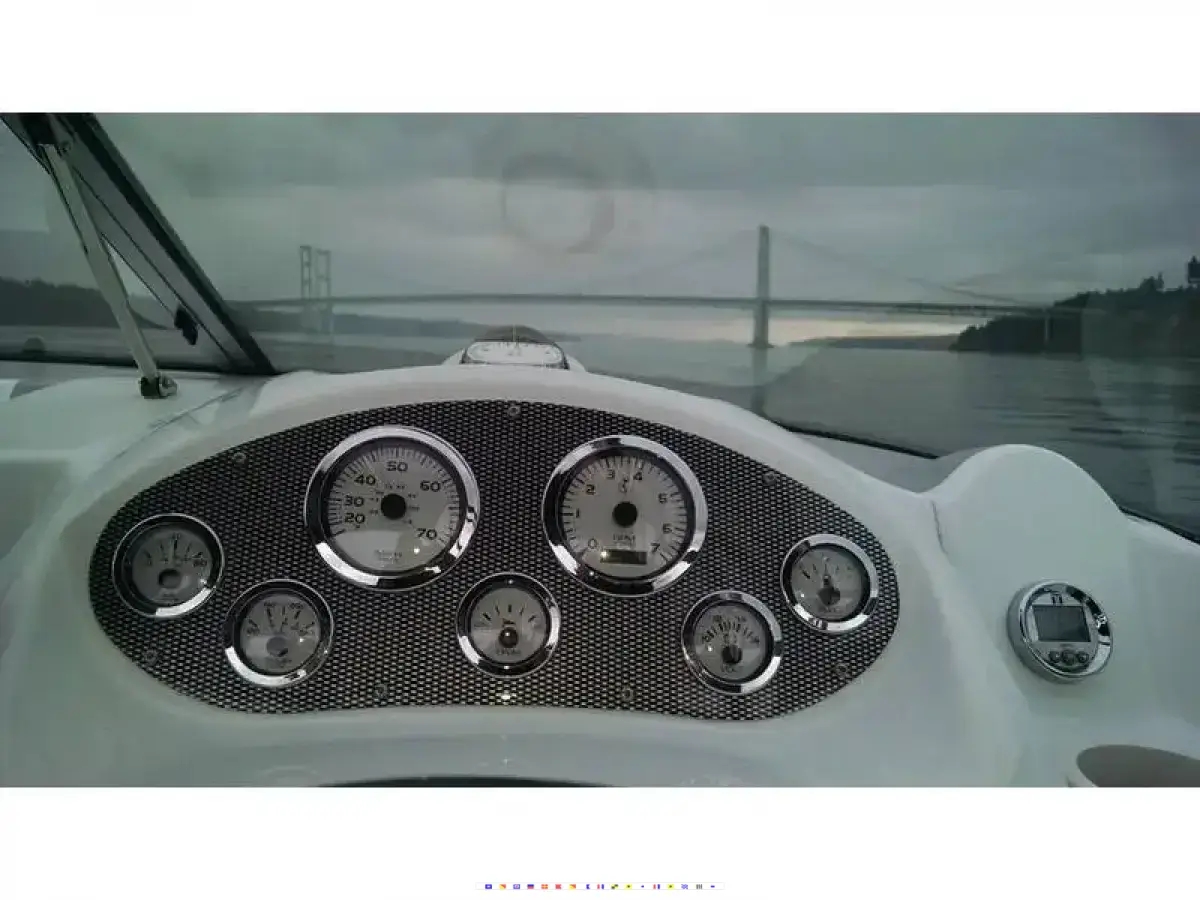 STOCK 496 8.1L, BRAVO 1, BENNETT TABS, CUSTOM BIMINI FOR SHADE WITH STRATAGLASS WINDSHIELDS FOR YEAR ROUND USE, COMES W - TWO COVERS (ONE BLUE, ONE BLACK), BOAT HAS BEEN IMPECCABLY MAINTAINED & KEPT SINCE NEW. BOAT IS SETUP W - EXTRA LARGE FENDERS, ANCHOR & EXTRA LINES. RAYMARINE CHARTPLOTTER GPS, BOLSTER SEATS, DUAL BATTERIES.