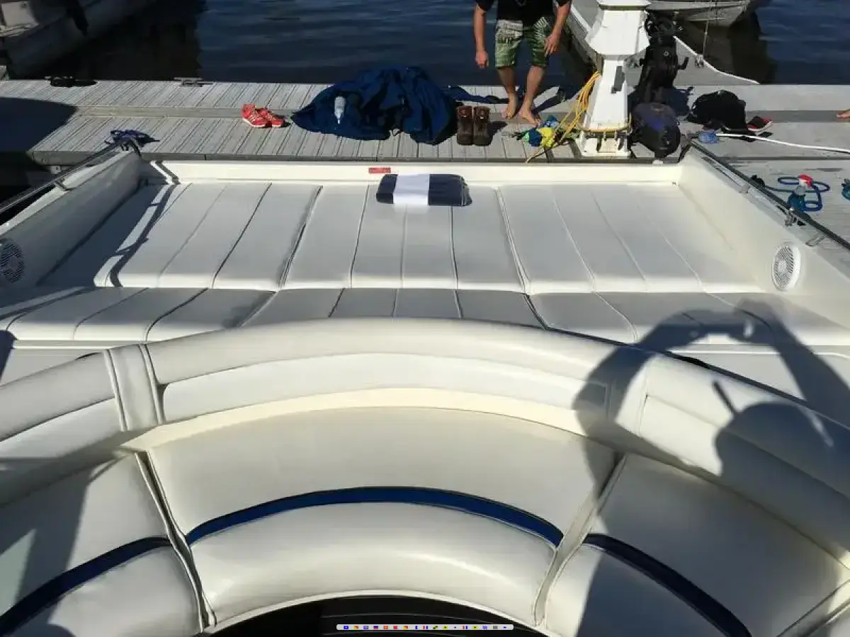 Boat house kept most of its life, fresh water only, well maintained and reliable. 700 hours, twin 454 magnum bravo 1. New full camper top making a Bimini top plus a quick sport cover. Fully equipped kitchenette, stand up bathroom with vacuflush , sleeps 4. Electric windlass anchor, new clarion sound system with 6 speakers, 2 subs, 2 amps, new Seadek flooring. This unique boat is 38 long and 11 wide with enormous amount of room and storage space but still sporty at cruising speed at 35 mph. Trailer mode on drives so you can go in 2 of water. Many more pictures available on request.