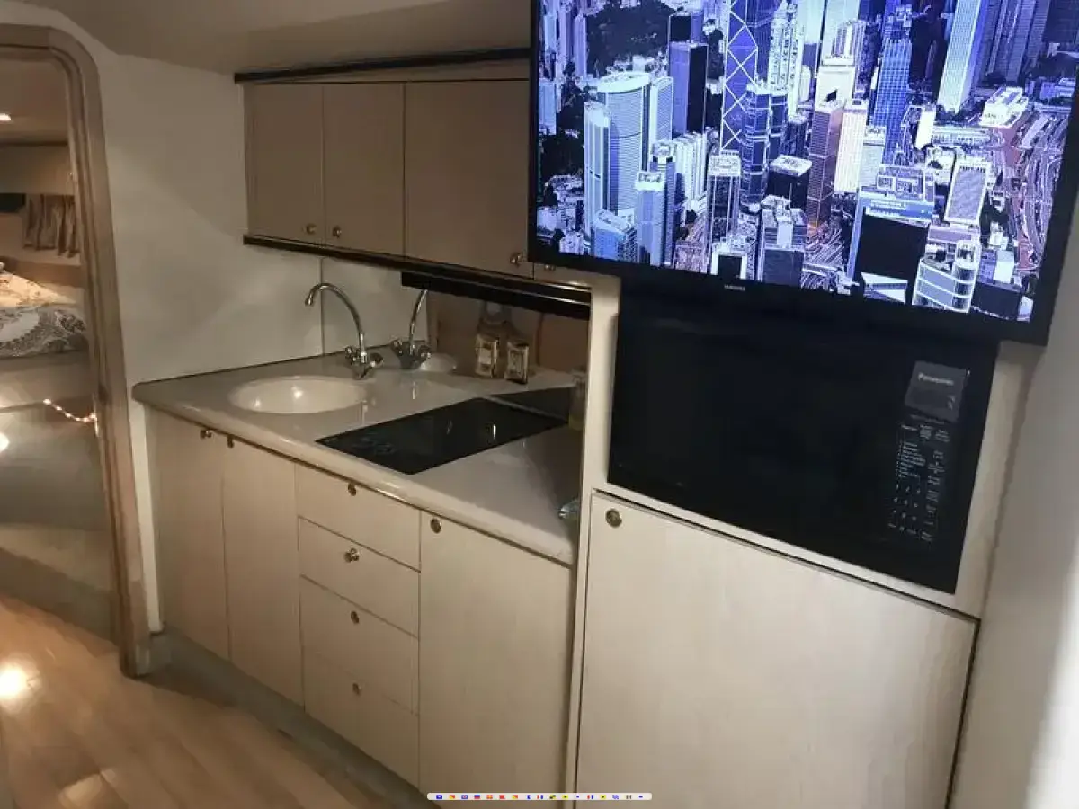 The gauges, throttles, and electronics are easily accessible and make driving the 48 express a pleasure. As you walk down the steps to the cabin, you are greeted by a large seating area and the galley on your starboard side. Forward is the master cabin with queen bed and head. To the rear you find an aft sleeping are that is also great for storage with privacy curtain.