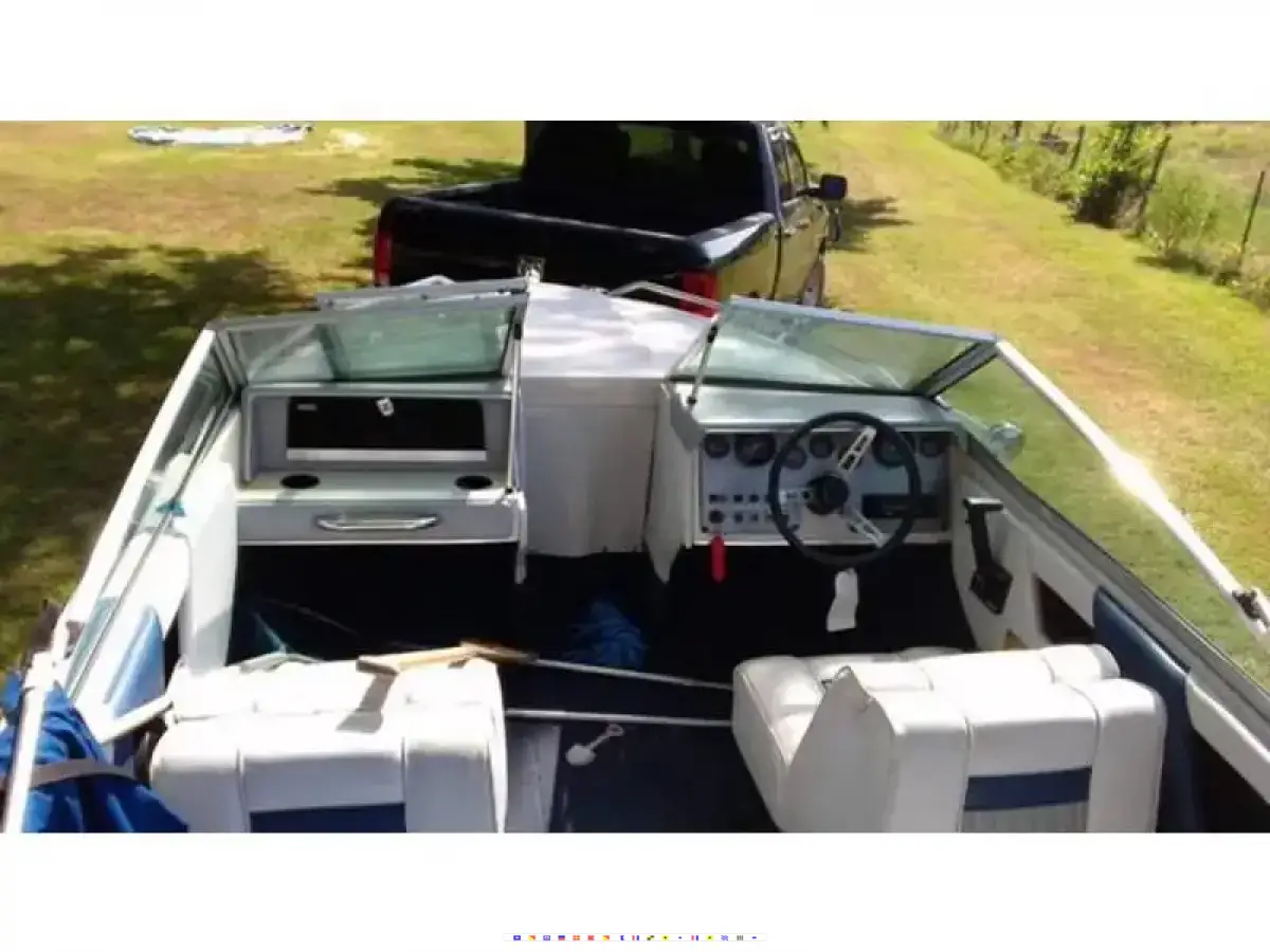 Blue and white inside and out, lower unit brand new good tires on trailer and interior good, lake ready, covered.