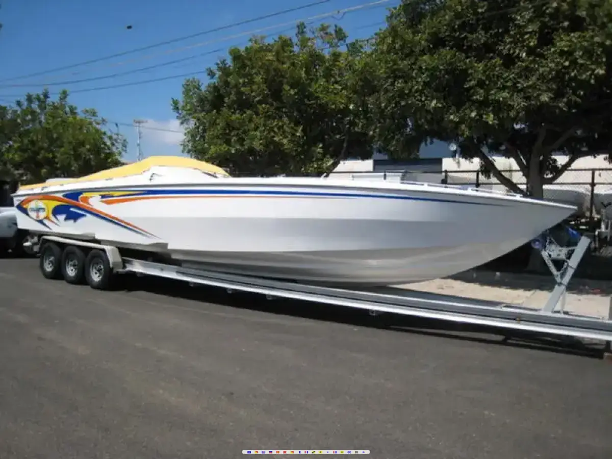2001 Cigarette 38' Top Gun,2001 Cigarette Top Gun with twin 700HP Mercury Racing HP500s with Vortech Superchargers. Built-in race/poker run headphone/microphone jacks, recently replaced valve springs on both engines, outdrives recently serviced. Outdoor pictures show old trailer. New Pacific Aluminum Triple Axle Trailer is shown in indoor photos. Trailer is included in the sale price. This boat is absolutely immaculate. You won't find one this clean for this price anywhere! Located in Southern California near Newport Beach. Call Bill at 626-278-4293.