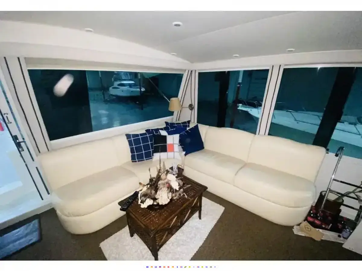 The enclosed Aft-Deck is accessed up 4 steps and aft from the salon and is enclosed, fully air-conditioned and offers great views of one's surroundings. Wing doors lead out to side-decks and forward to the foredeck. Just forward and up 3 easy steps from the aft-deck one accesses the fully air-conditioned enclosed Fly-bridge and helm station. Also, a sliding door leads aft from the aft-deck and outside to a small line-handling deck and 4 steps lead aft and down from here to the fiberglass cockpit. A transom door leads from the cockpit to the fiberglass swim platform.