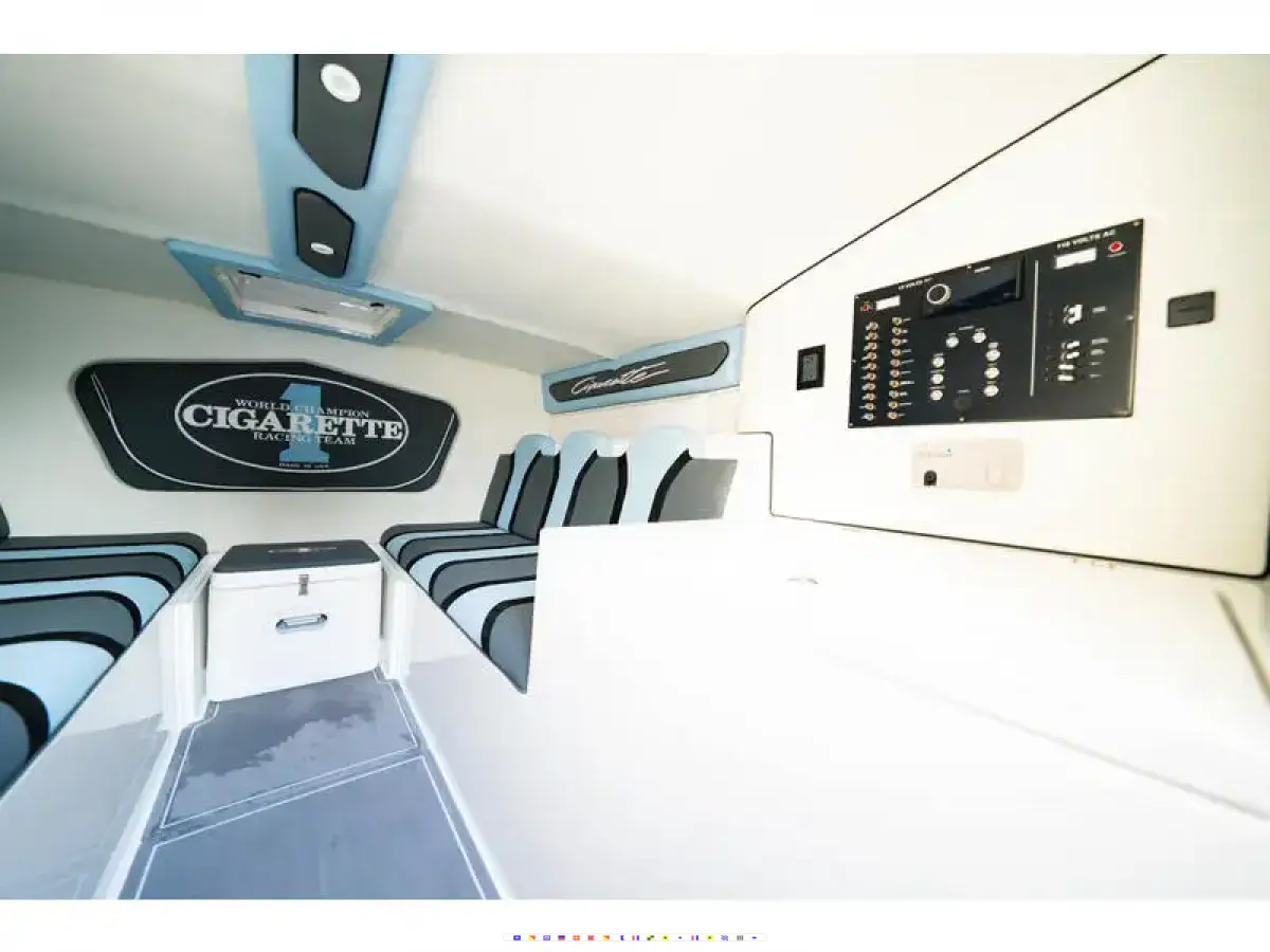 This is the most innovative performance boat Cigarette has ever built, designed from the ground up, utilizing the latest technologies and methodologies in design. The 515 deck applies a carbon-fiber, vacuum bagged sandwich construction to provide high rigidity at a lighter weight - over 1.7x more flexural rigidity than typical construction methods. As the highest point on the boat, special consideration was given to keeping the deck light weight to optimize performance dynamics of the boat.Technologically advanced as it is beautiful, the carbon fiber engine hatch is strong, light weight and functional. Cigarette Racing stresses the smallest of details, no more evident than a hatch that exemplifies aesthetics while reducing weight for overall performance. Along with spacious cabin room the 515 sits 6 passengers comfortably.