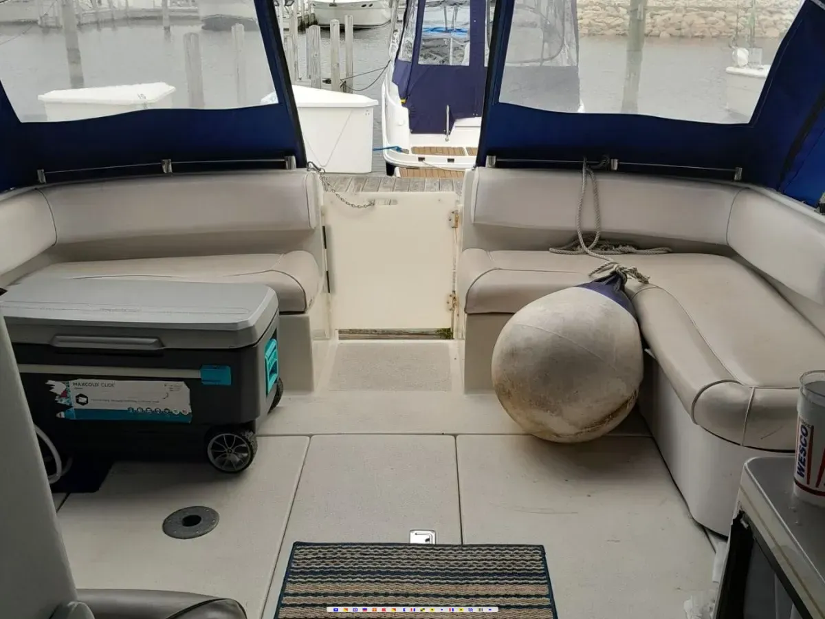 The Chris Craft 360Express has a somewhat unusual layout. Mid-cabin lounge extending into the salon, very spacious bi-level cockpit, transom door, double helm seat with a built in wet bar.