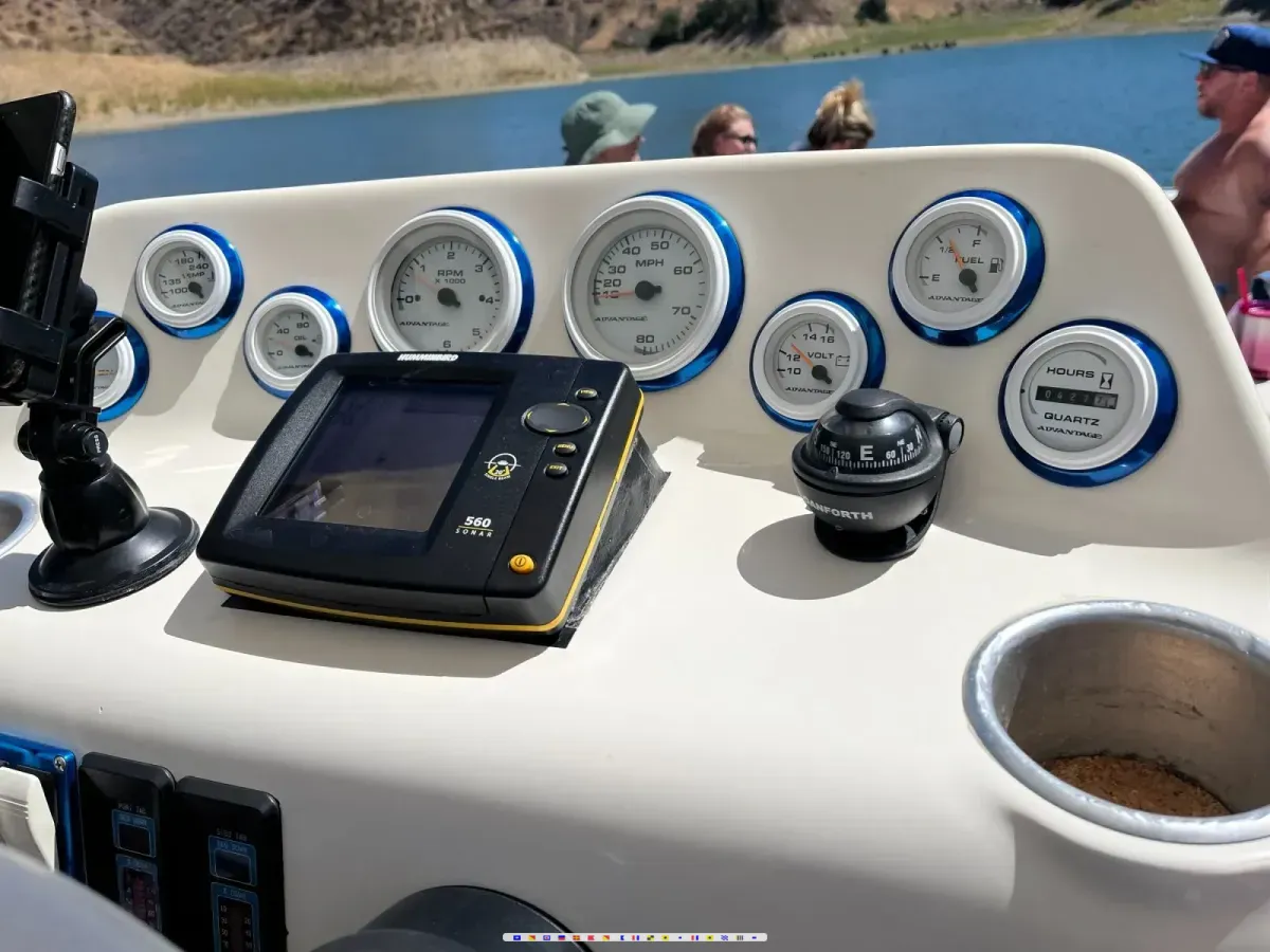 Included with the boat are: 3 anchors, 3 mooring lines, 5 bumpers, boat cushion, 10 life jackets, 2 person tube, ski ropes, 2 built-in removable deck tables, extra long jumper cables, HummingBird Sonar Fish & Depth Finder, Dash Compass, Bennit Trim Tabs, 8 speaker sound system, and so much more. Reliable power and responsive handling. Sleek, stable, and ready for the lake