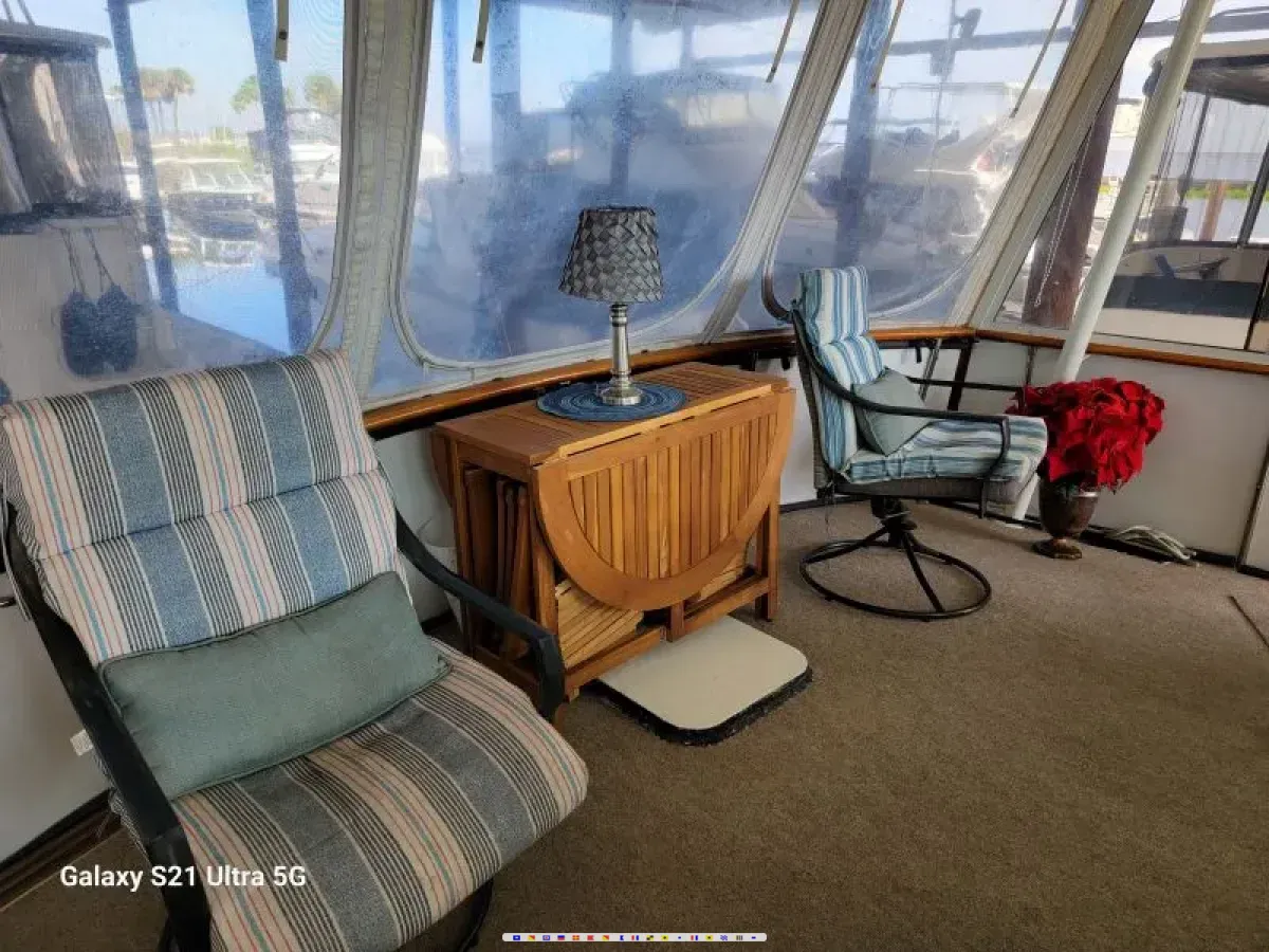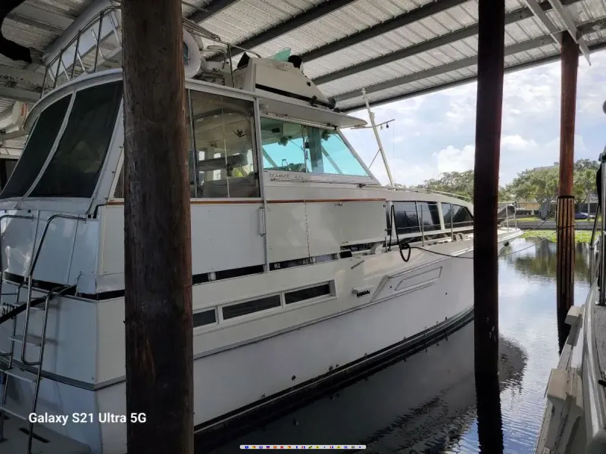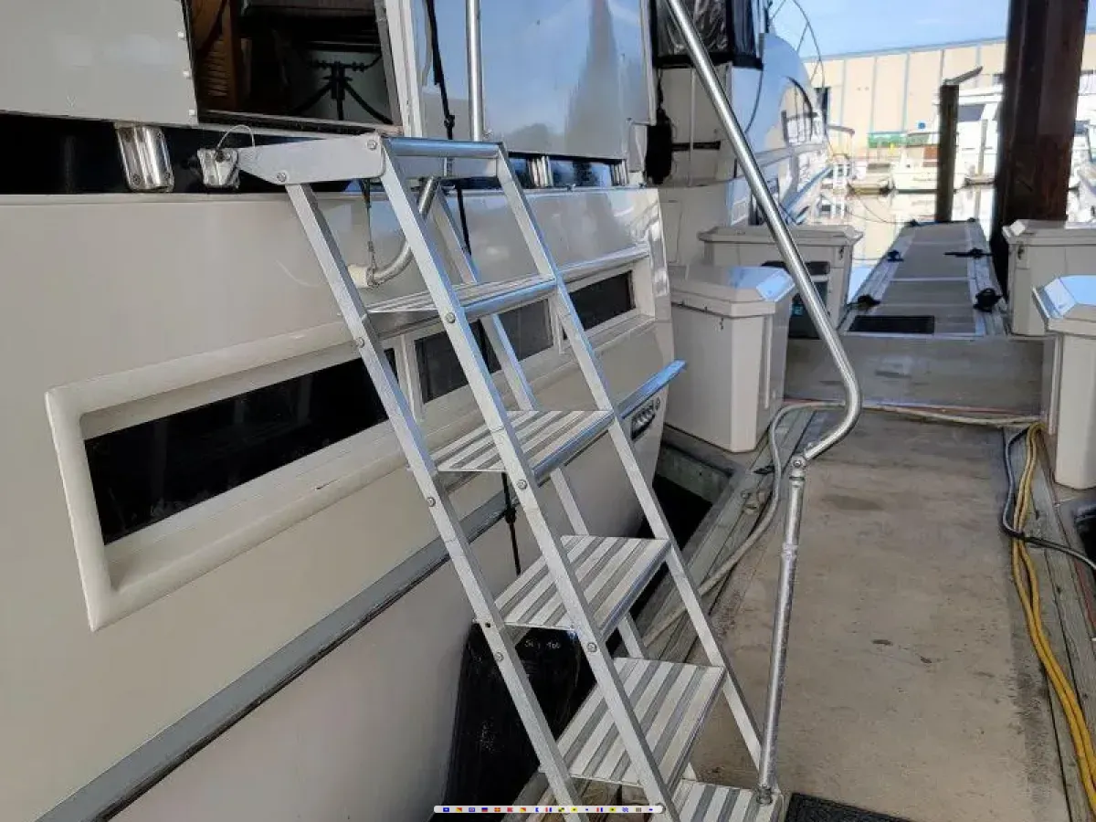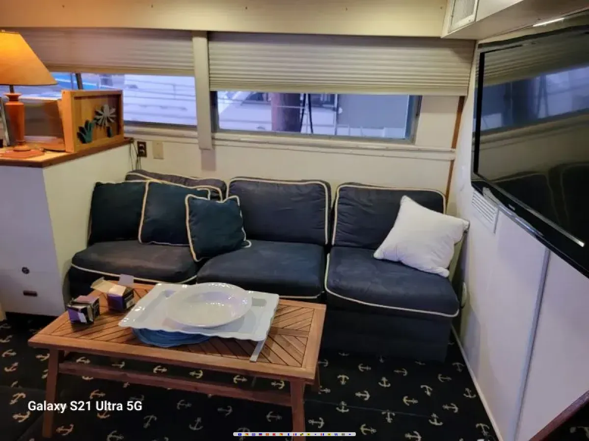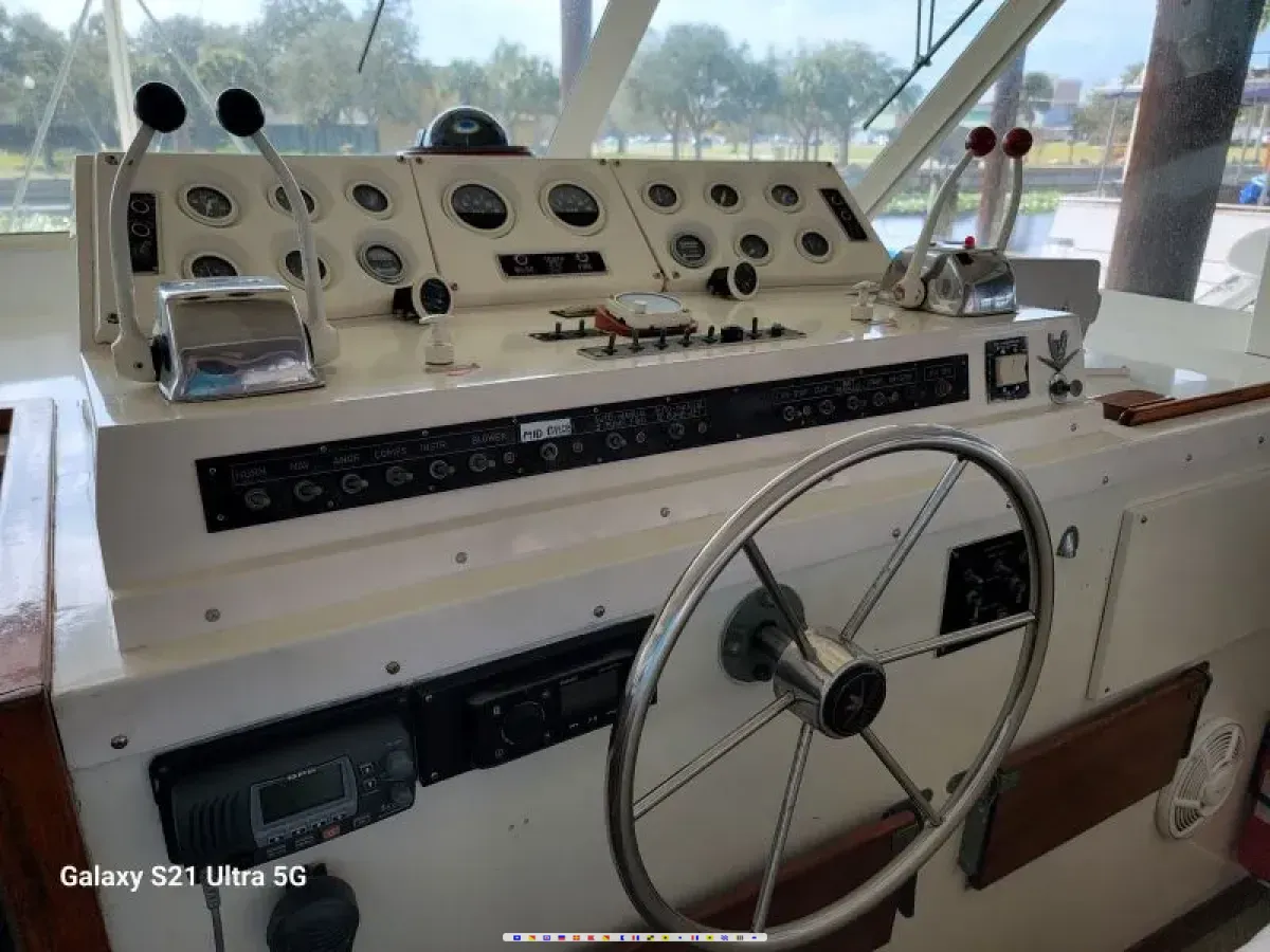 Midnight Sun Too is a 1979 model that has undergone an interior refit throughout the years. Both cabins and the galley now have teak and holly soles with fitted carpeting in the salon. The dinette has been redone and the interior furniture consists of a three-piece sectional settee with a Stressless (brand) tan leather covered swivel recliner with ottoman. She is also equipped with a late model Onan 11.5 KW generator and four (4) reverse cycle marine air conditioners. The gelcoat is shiny indicating a well-cared for vessel.